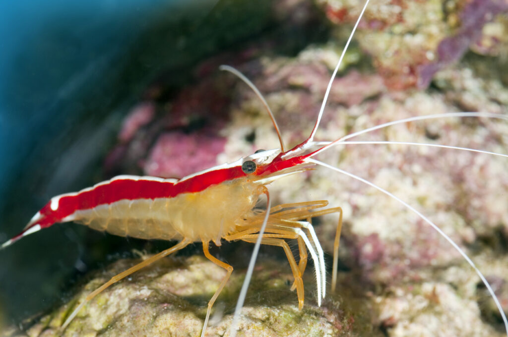Cleaner shrimp (Lysmata amboinensis) are found among coral and sea anemones. They play a key role as “reef cleaners”, setting up stations where they actively remove parasites and dead tissue from larger fish. They form symbiotic relationships with fish such as moray eels and groupers, which benefit from the cleaning service and do not eat the shrimp.