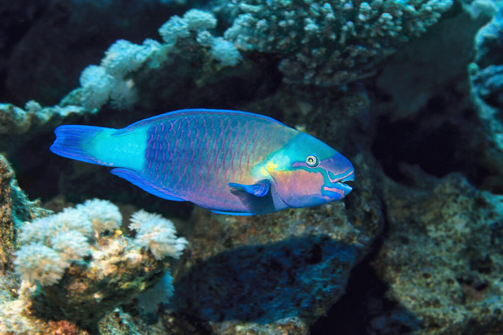 Parrotfish (Scaridae) are common inhabitants of tropical and subtropical reefs worldwide, often preferring shallow, sunlit waters. They are crucial for maintaining the reef’s health. Using their distinctive beak-like teeth, they scrape algae and dead coral from the reef surface. This feeding behaviour keeps the coral clean and healthy, a vital job for the entire ecosystem.