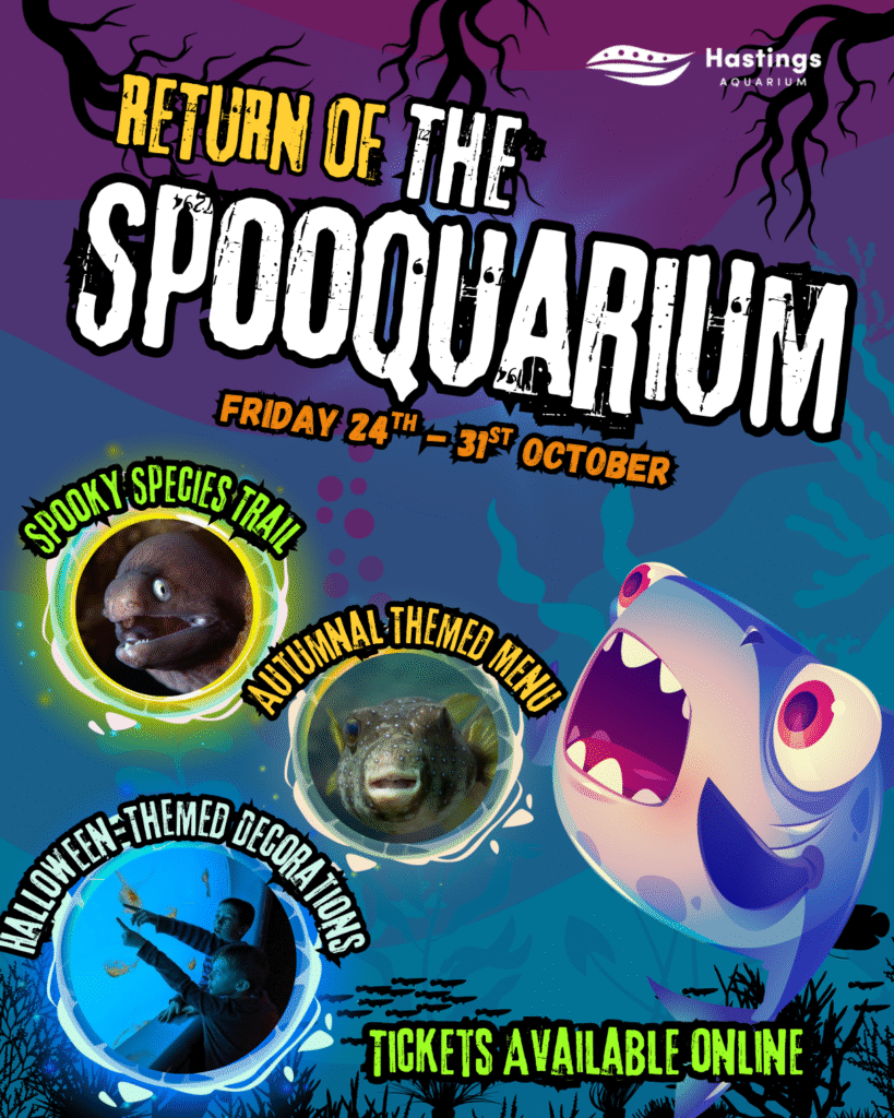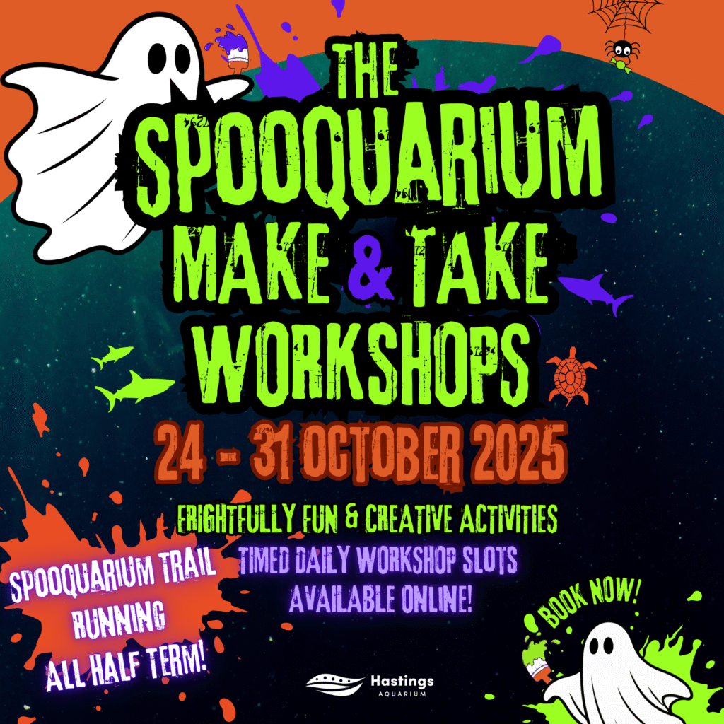 Looking for fang-tastic half-term fun? Join us at Hastings Aquarium (24–31 Oct) for spooky crafts, face painting & ocean adventures!
